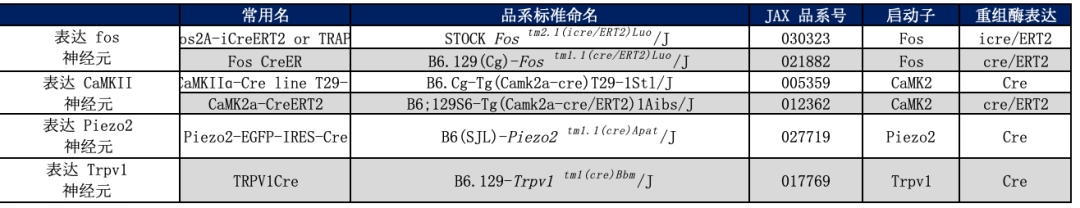 神经领域相关的Cre小鼠模型通常是由某一特定启动子来驱动Cre表达,如神经递质相关的启动子等,以此来标记一类神经元。同时,如果需要对Cre的表达时间进行操控,可以使用诱导型Cre,如Cre-ERT2系统。下面列出了一些神经领域研究中常用的Cre品系。