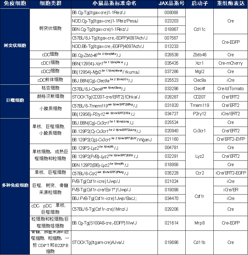 免疫细胞来源于骨髓中的造血干细胞 (HSCs),在生长因子和多种细胞因子 (包括集落刺激因子、白细胞介素) 的调控下,造血干细胞可分化成各类免疫细胞。HSCs及其分化子代可以通过特定细胞表面谱系标记物 (如分化簇CD蛋白和细胞因子受体) 或特有的转录因子等来进行识别。免疫细胞特异性表达Cre的常见构建策略,就是利用其特异性分子标记或转录因子的启动子来控制Cre的表达,启动子的特异性决定了Cre表达的特异性,包括Cre表达的细胞类型、起始时间等。下表列出了一些常见的免疫细胞Cre小鼠品系。