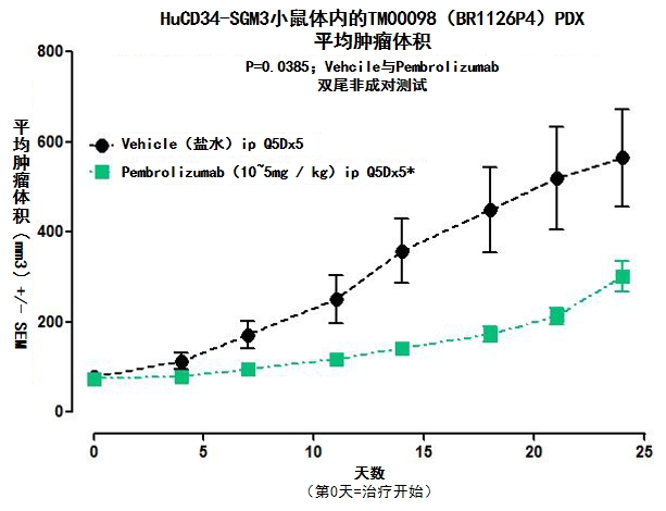 (图1. :Hu-NSG™-SGM3小鼠中的人PDX乳腺肿瘤TM00098 对Pembrolizumab(Keytruda)的响应)