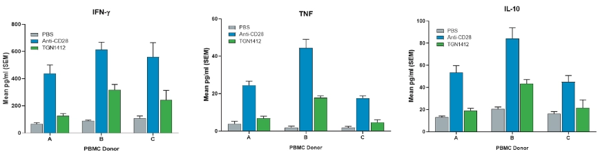 (图1:hu-PBMC-NSG小鼠被注射了溶剂 (PBS) 或两种不同的CD28/CD抗体28和TGN1214超激动剂。直方图表示所示化合物诱导的促炎细胞因子的数量。横轴表示不同的供体(A、B 和 C)。值得注意的是,T细胞超激动剂CD28抗体 和TGN1412对免疫细胞的过度活化程度因供体而异,反映了人类群体中免疫应答的多样性。)