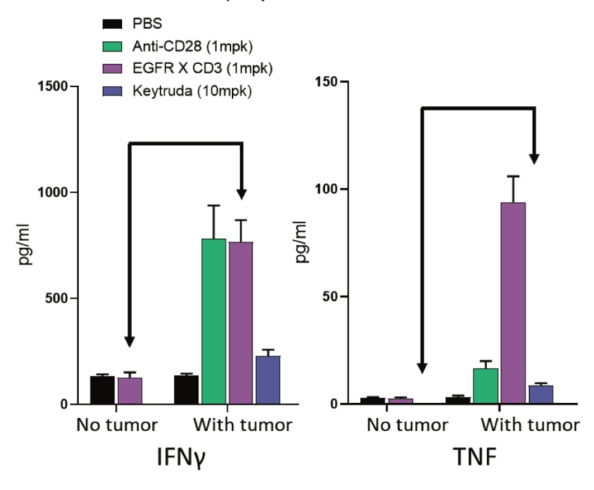 (图2:移植或未移植MDA-MB-231的hu-PBMC-NSG小鼠分别用PBS(溶剂)、CD28抗体(阳性对照)、Keytruda(阴性对照)或针对EGFR的CD3双特异性抗体进行处理。仅肿瘤携带小鼠表现出双特异性抗体介导的免疫毒性(如箭头所示)