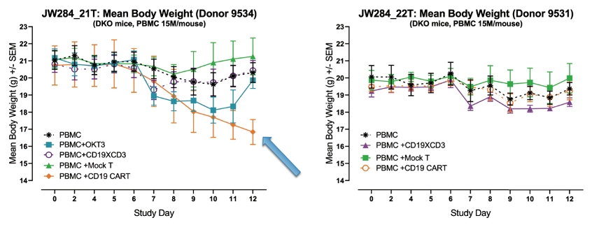 (图5:来自供体9534(左)或9531(右)的hu-PBMC-NSG小鼠的平均体重。每种疗法的符号显示在各图左下角。值得注意的是,植入供体9534的PBMC细胞并且采用CD19 CAR T疗法的小鼠显示出CRS导致的痛苦迹象(箭头))