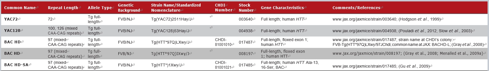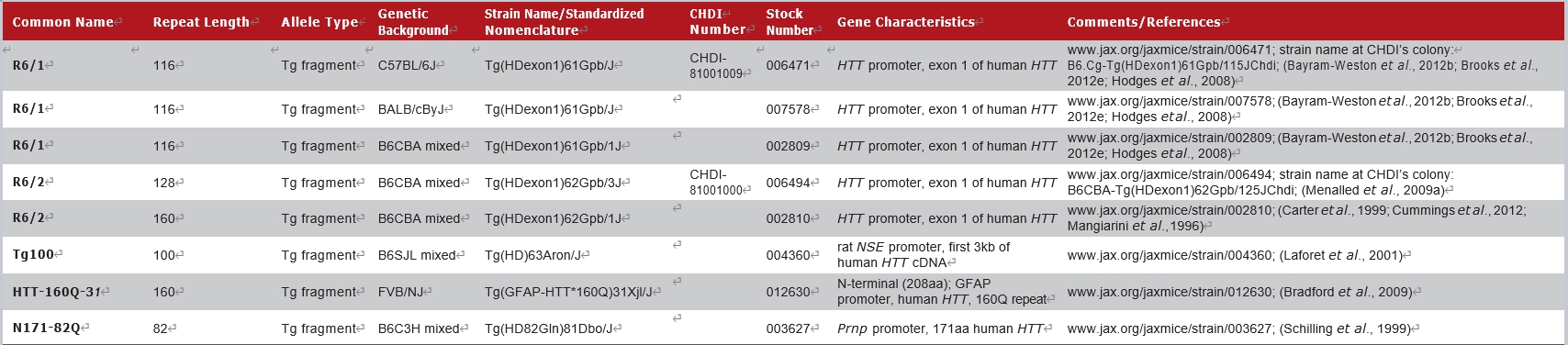 JAX拥有的部分HTT全长转基因小鼠模型如下: