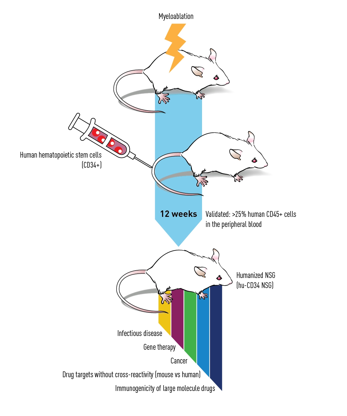 Hu-CD34-NSG™ 和 hu-CD34-SGM3 是免疫学、免疫肿瘤学、传染性疾病等领域长期体内研究的理想模型,在 CD34+ 植入后的寿命超过 12 个月。