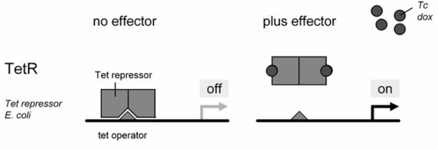 四环素 (Tetracycline, Tet) 诱导系统是由E.coli大肠杆菌中Tn10转座子改造而来,可以依赖于四环素进行可逆地调控基因表达。如下图所示,该系统在大肠杆菌中由四环素阻遏蛋白 (Tet repressor, TetR) 和Tet操纵子 (Tet operator, TetO) 组成。在缺乏四环素 (Tc) 或其衍生物强力霉素 (dox) 的情况下,TetR二聚体与TetO结合,阻断基因表达 (左图)。 当Tc或dox与TetR结合时,诱导TetR构象变化,导致其与TetO分离并促进基因表达 (下图)。