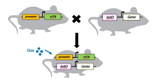 以Tet on为例,在小鼠中通常将rtTA元件和tetO元件分别构建在不同的小鼠品系当中, 而rtTA可以在不同的启动子下驱动,以达到特异性组织诱导的功能。两个小鼠品系配繁的后代,即可通过Dox的给药或去药,达到在特异组织中可逆调控基因表达的目的。