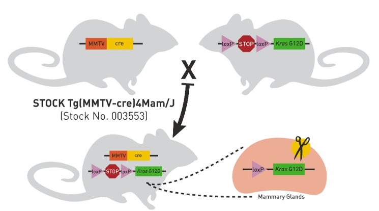 例如:使用STOCK Tg(MMTV-cre)4Mam/J (#003553) cre小鼠和B6.129S4-Krastm4Tyj/J (#008179) floxed 小鼠进行杂交,如下图。只需要将他们杂交一代,得到的F1代就可 以在乳腺中敲除LSL元件,进而特异表达 Kras*G12D点突变基因。如果表达的基因是GFP荧光或者LacZ等显色基因,常常作为报告小鼠品系用来确认Cre的特异性。