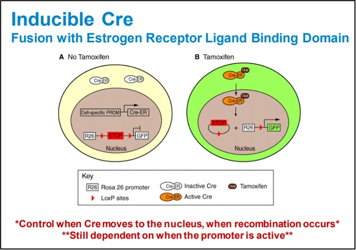 Cre-ER是Cre重组酶与雌激素受体 (estrogen receptor, ER) 激素结合域的融合蛋白。 未使用雌激素或雌激素类似物他莫昔芬 (Tamoxifen) 诱导时,Cre重组酶停留在细胞质中,无法对loxP位点进行重组。在经Tamoxifen诱导后,Cre重组酶进入细胞核中启动loxP位点重组。(图 4)