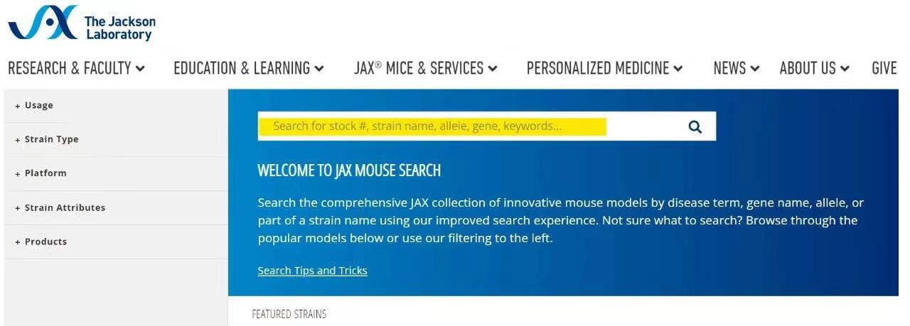 杰克森实验室小鼠资源库目前保有12,500多个小鼠品系,该数据库为最常用的JAX®小鼠数据库。常见的查找方式有: