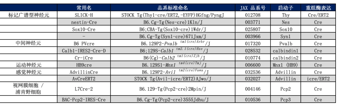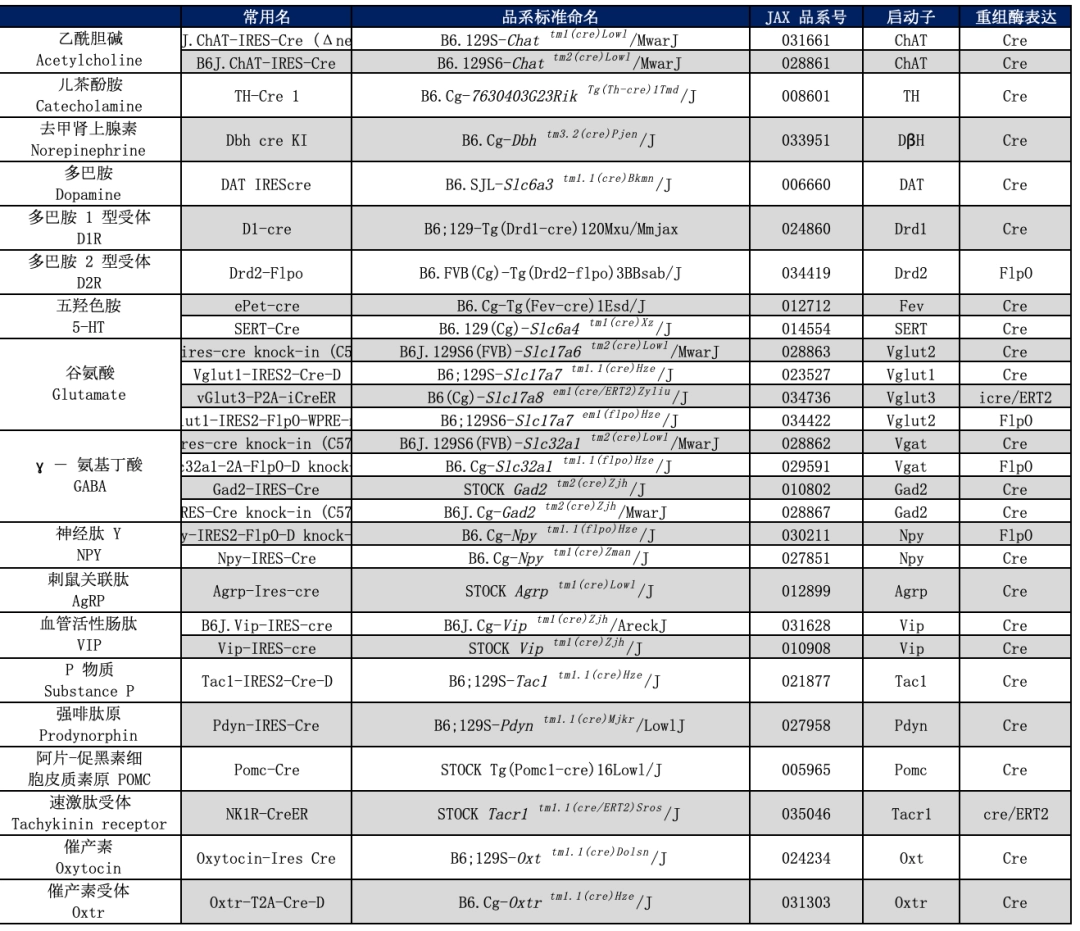 神经领域相关的Cre小鼠模型通常是由某一特定启动子来驱动Cre表达,如神经递质相关的启动子等,以此来标记一类神经元。同时,如果需要对Cre的表达时间进行操控,可以使用诱导型Cre,如Cre-ERT2系统。下面列出了一些神经领域研究中常用的Cre品系。