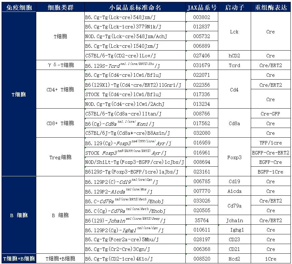 1. 常见的淋巴细胞Cre品系