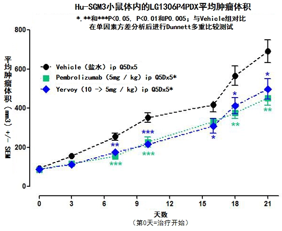 (图2:Hu-NSG™-SGM3小鼠中的肺PDX TM00302(LG1306)对Keytruda和Yervoy的响应。)