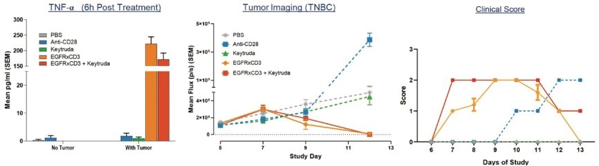 图3为靶向EGFR的CD3双特异抗体与Keytruda联合治疗的实例。结果表明,联合用药不会增加治疗毒性,但也不会产生任何疗效优势。
