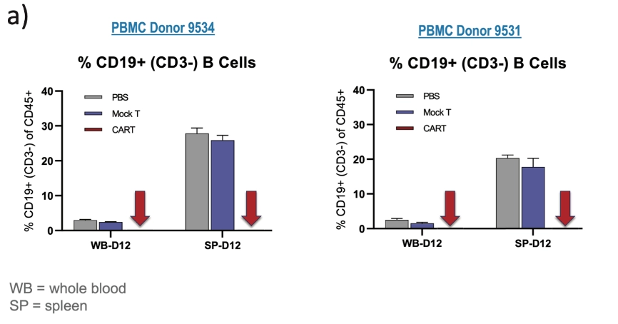 (图4:不同供体表现出不同的活性/毒性比率。当比较图4a中两个单独的供体时,在两项研究中,模拟CAR T疗法对血液或脾脏中的B细胞比率均没有影响。代表CAR T的箭头指向100%去除PBMC衍生的正常CD19+ B细胞,表明对两个供体的疗效和反应是完成的。)