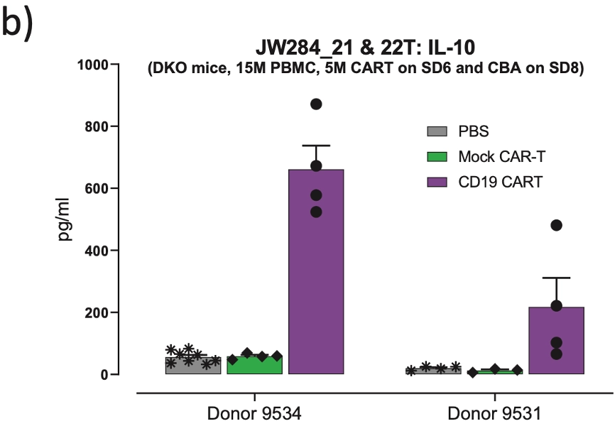(图4b显示了两个供体间相差较大的细胞因子反应(本例展示 IL-10),表明供体9531可能从CAR T疗法中获益,而没有广泛的毒性。WB:全血;SP:脾脏))