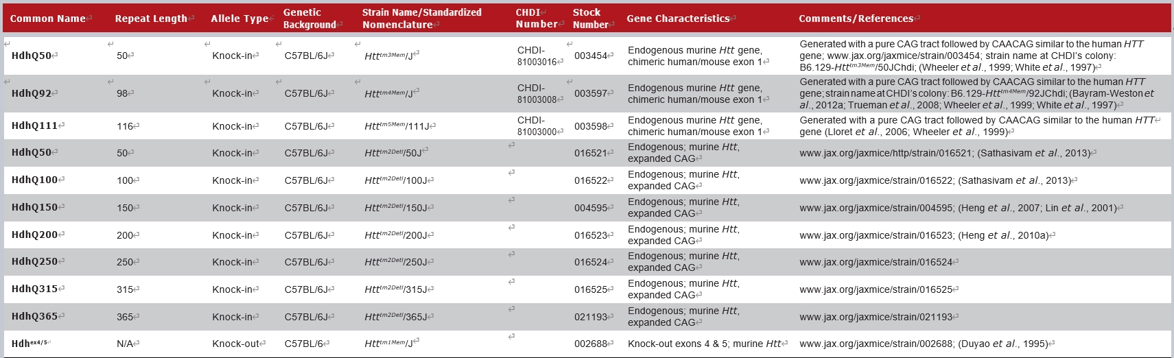JAX拥有的部分HTT全长转基因小鼠模型如下: