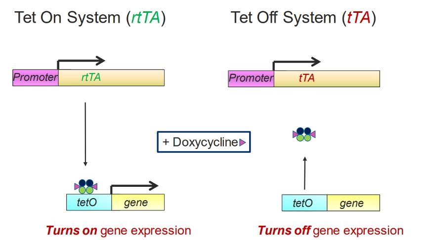 如下图所示:TetR还被改造为存在Dox的情况下,分别起到结合或不结合TetO两种效果,即Tet on/off系统。Tet on系统中,tetR被改为rtTA,在Dox存在条件下,可以与tetO结合开启下游基因表达,因此为Tet on系统;Tet off 系统中,tetR被改造为tTA, 其与Dox结合后从TetO元件上解离下来,关闭基因表达,因此为Tet off系统。