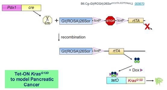 比如:我们先利用Pdx1-cre小鼠和带有LSL元件的rtTA floxed小鼠配繁,使其后代在胰腺表达rtTA蛋白。再将这个小鼠与携带tetO元件的Kras*G12D小鼠配繁,其后代小鼠就可以在Dox诱导下调控Kras*G12D蛋白的表达了。