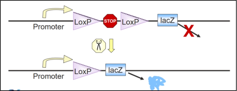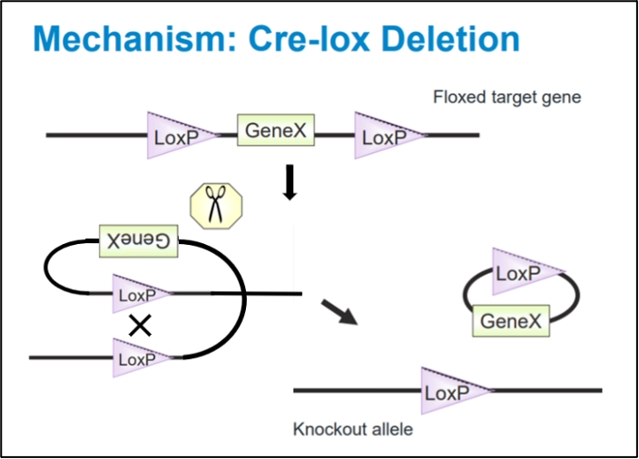 携带loxP的小鼠被称为floxed小鼠,当它与Cre小鼠交配后,Cre-loxP系统开始工作, 可以对两个loxP位点以内的基因进行重组,进而实现基因敲除、表达等目的。