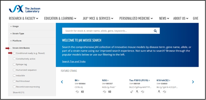 使用 JAX® Mice Database (JAX® 小鼠资源库)来进行搜索。您可以使用筛选框内Strain Attributes – Conditional ready (e.g. floxed) 条件 (图 5)。
