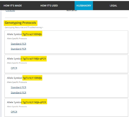 以strain#: 003831为例,在进入小鼠品系详情页面后,选择Husbandry - genotyping protocol,即可查看该品系基因鉴定的方法(如下图)。