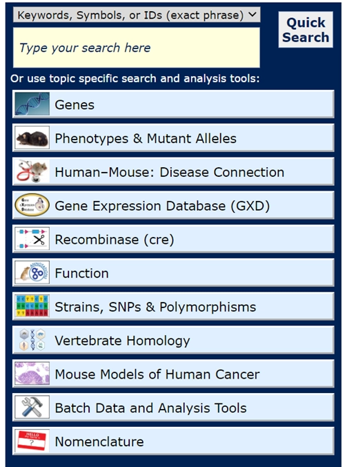 在完成研究框架构建的思考后,可以根据感兴趣的基因,突变的类型或疾病类型使用以下数据库,对小鼠品系进行检索。以下三个数据库是最常用的小鼠信息数据库: