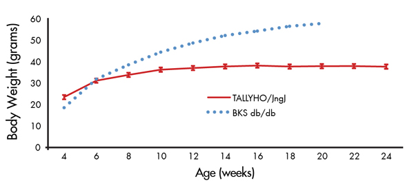 TALLYHO/JngJ 雄性小鼠会在使用标准小鼠普通饲料(6% 脂肪,w/w)饲养时患上糖尿病。该新兴的 II 型糖尿病多基因模型的特点是: