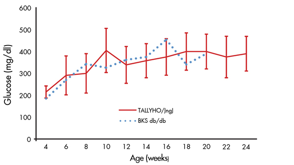 图 2. TALLYHO/JngJ 小鼠的非空腹血糖水平升高。两周测量一次雄性 TALLYHO/JngJ 小鼠的非空腹血糖水平。数据为 20 只小鼠的平均值加减标准差。作为参照,还纳入了另一项研究中 BKS db/db 小鼠 (BKS.Cg-Dock7m +/+ Leprdb/J, 品系货号 000642) 的平均血糖值.